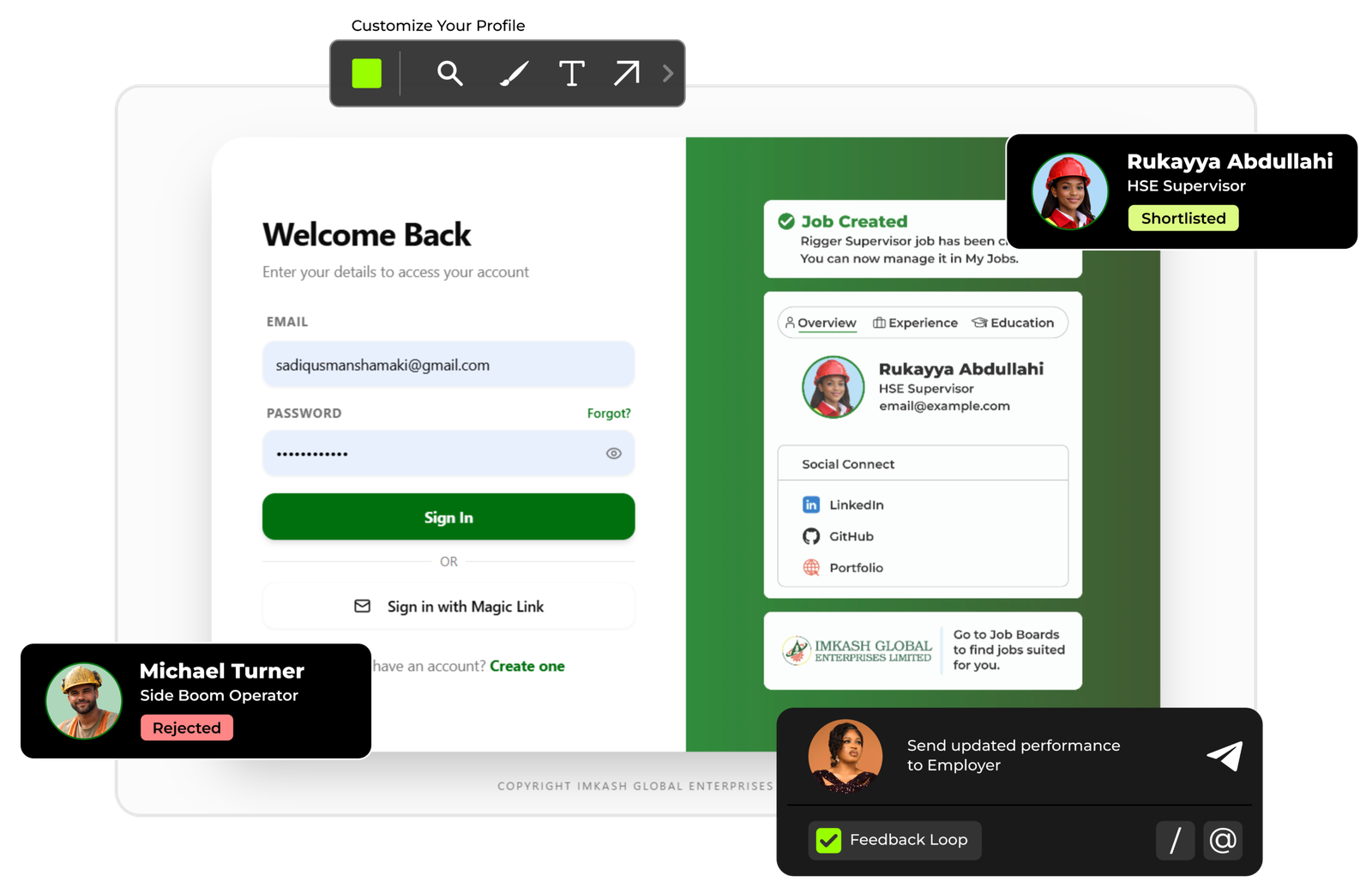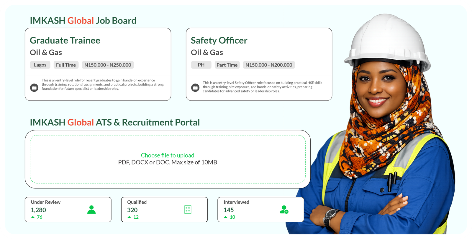 Job Seekers can apply through the IMKASH Job Board or through a link shared by an Employer. Applicants can upload their CV, submit required documents, and track their application status.